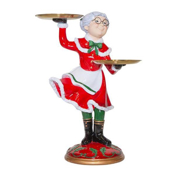 A beautiful piece of Christmas cheer. Mrs Claus with Tray decoration. Standing 62 cm tall, this charming figure captures the warmth and spirit of Christmas. Dressed in her signature red dress with white trim, green accents, and a friendly smile, Mrs Claus is ready to serve up holiday joy.